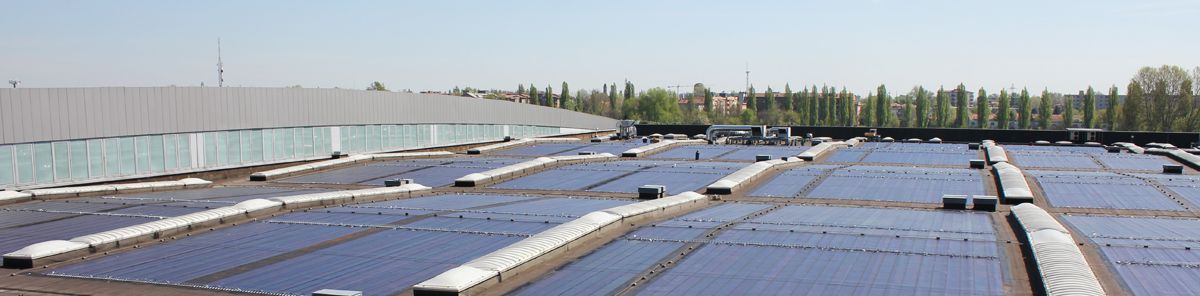 Impermeabilizzazione con fotovoltaico integrato realizzata con sistema General Solar PV su esteso edificio commerciale nel modenese.