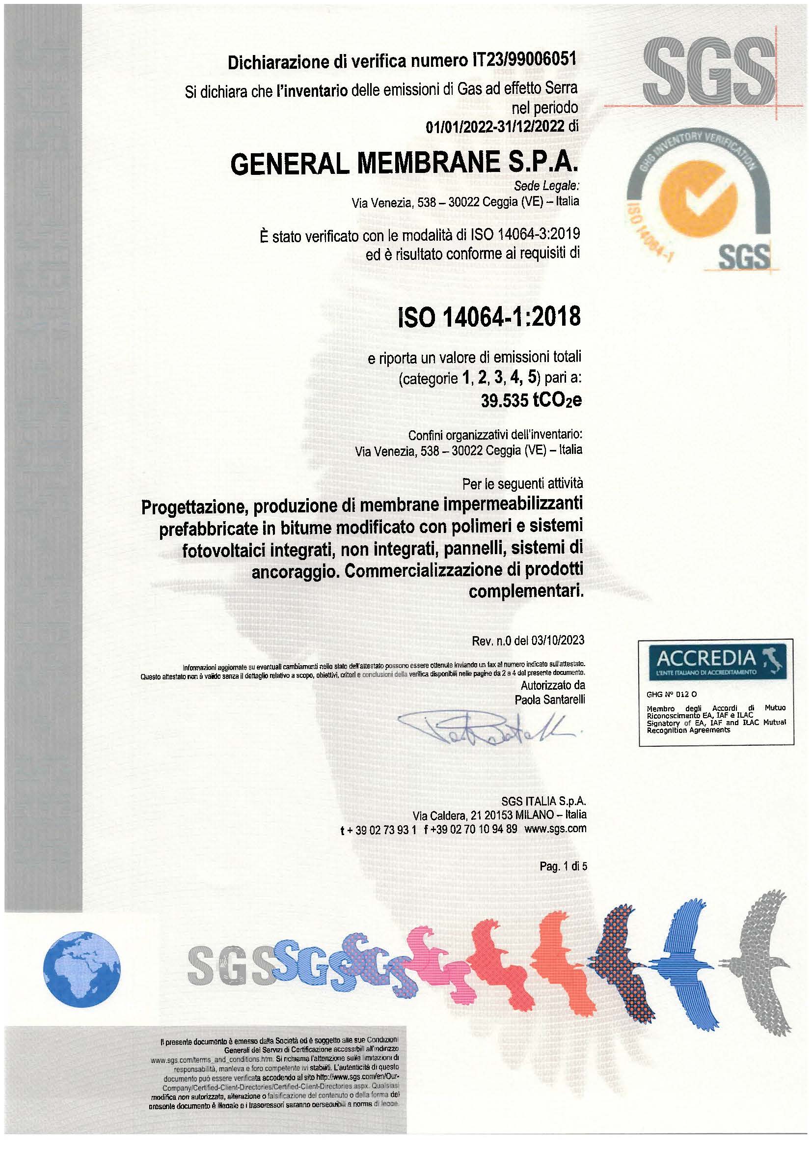 Lo studio della Carbon Footprint di General Membrane, iniziato nel 2011 e tutt’ora in corso, è stato realizzato e certificato dall'ente terzo SGS secondo la nuova edizione dello standard internazionale UNI EN ISO 14064-1:2018. L'Azienda provvede al rinnovo della certificazione ogni tre anni. L’ultimo aggiornamento del report disponibile è quello relativo all’anno 2018.