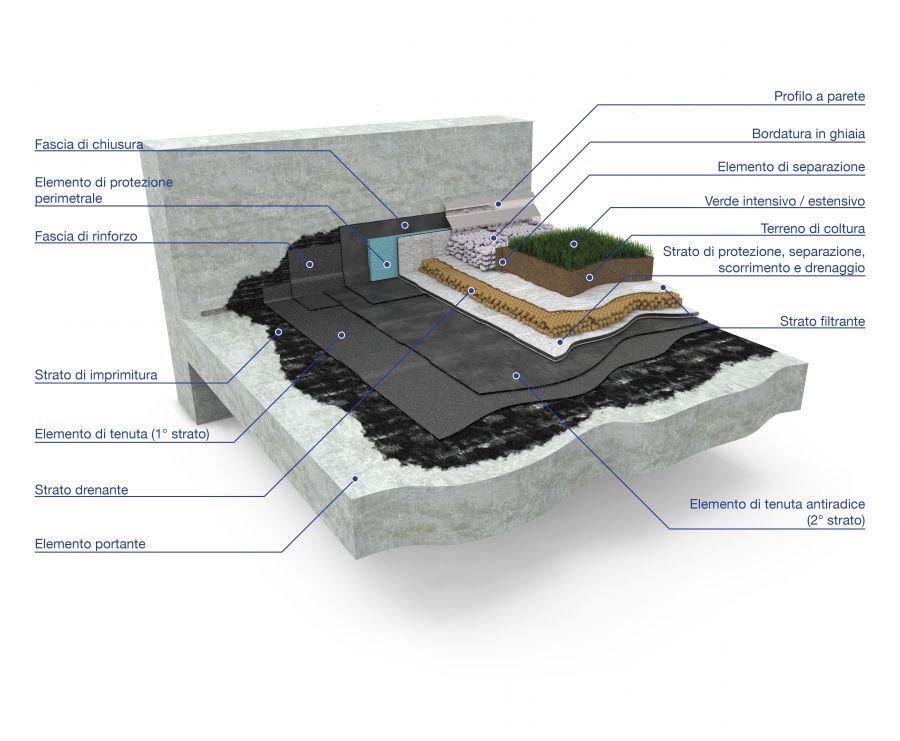 4. Elemento di tenuta antiradice (secondo strato): Fornitura e posa in opera di General Garden FLL 4 mm. Posa in totale aderenza