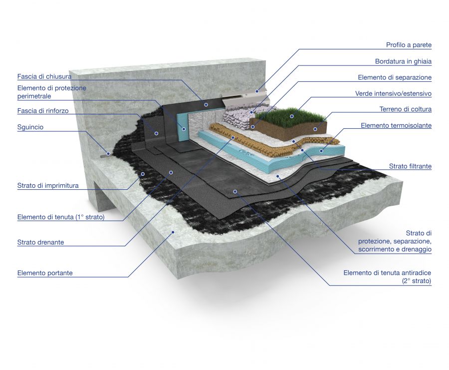 4. Elemento di tenuta antiradice (secondo strato): Fornitura e posa in opera di General Garden FLL 4 mm. Posa in totale aderenza