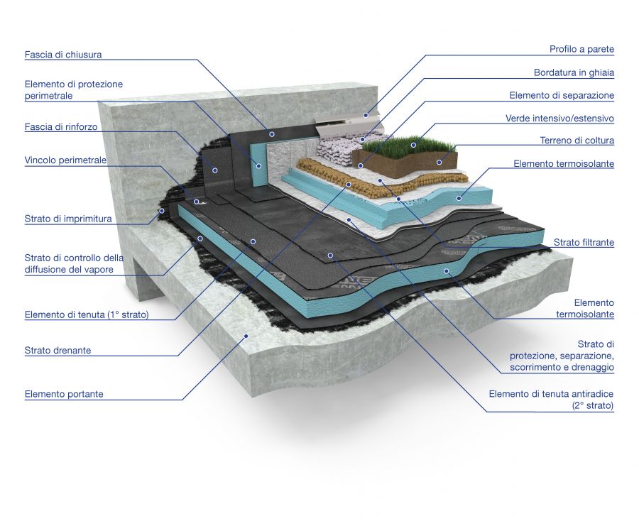 6. Elemento di tenuta antiradice (secondo strato): Fornitura e posa in opera di General Garden FLL 4 mm. Posa in totale aderenza