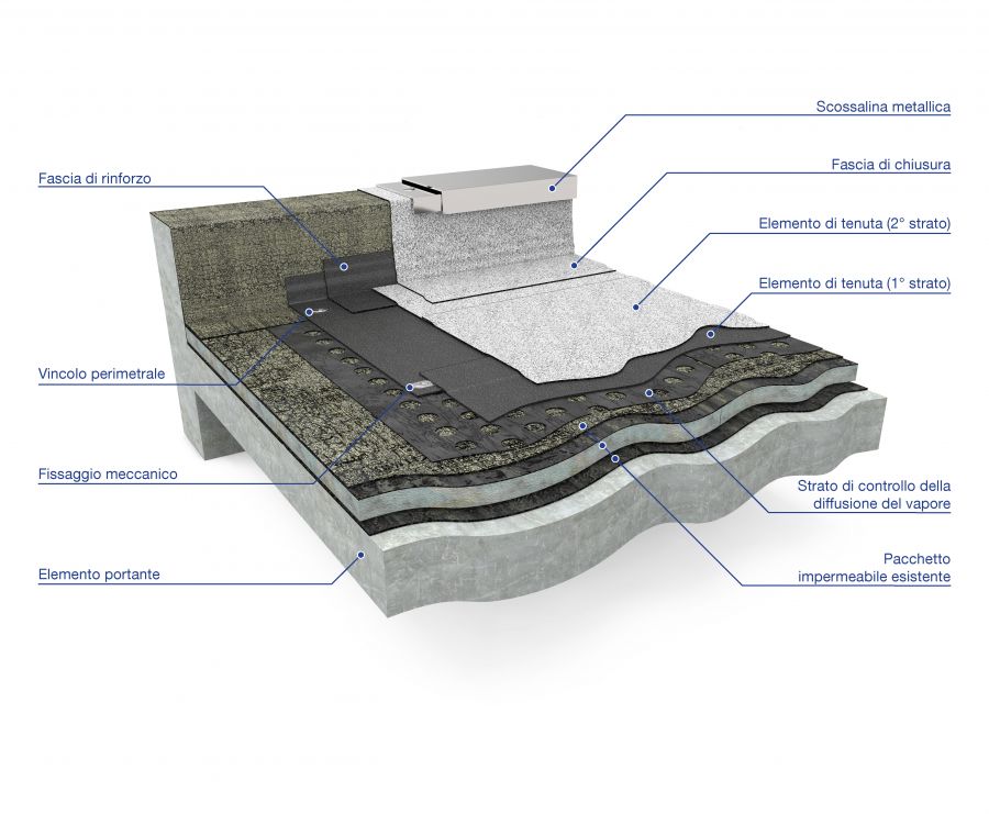 1. Supporto di base : Pacchetto impermeabile esistente con strato superficiale in membrana bituminosa