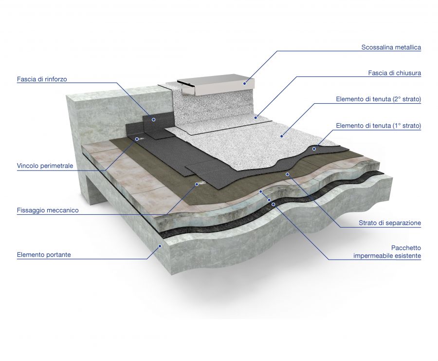 - Supporto di base : Pacchetto impermeabile esistente con strato superficiale in membrana bituminosa